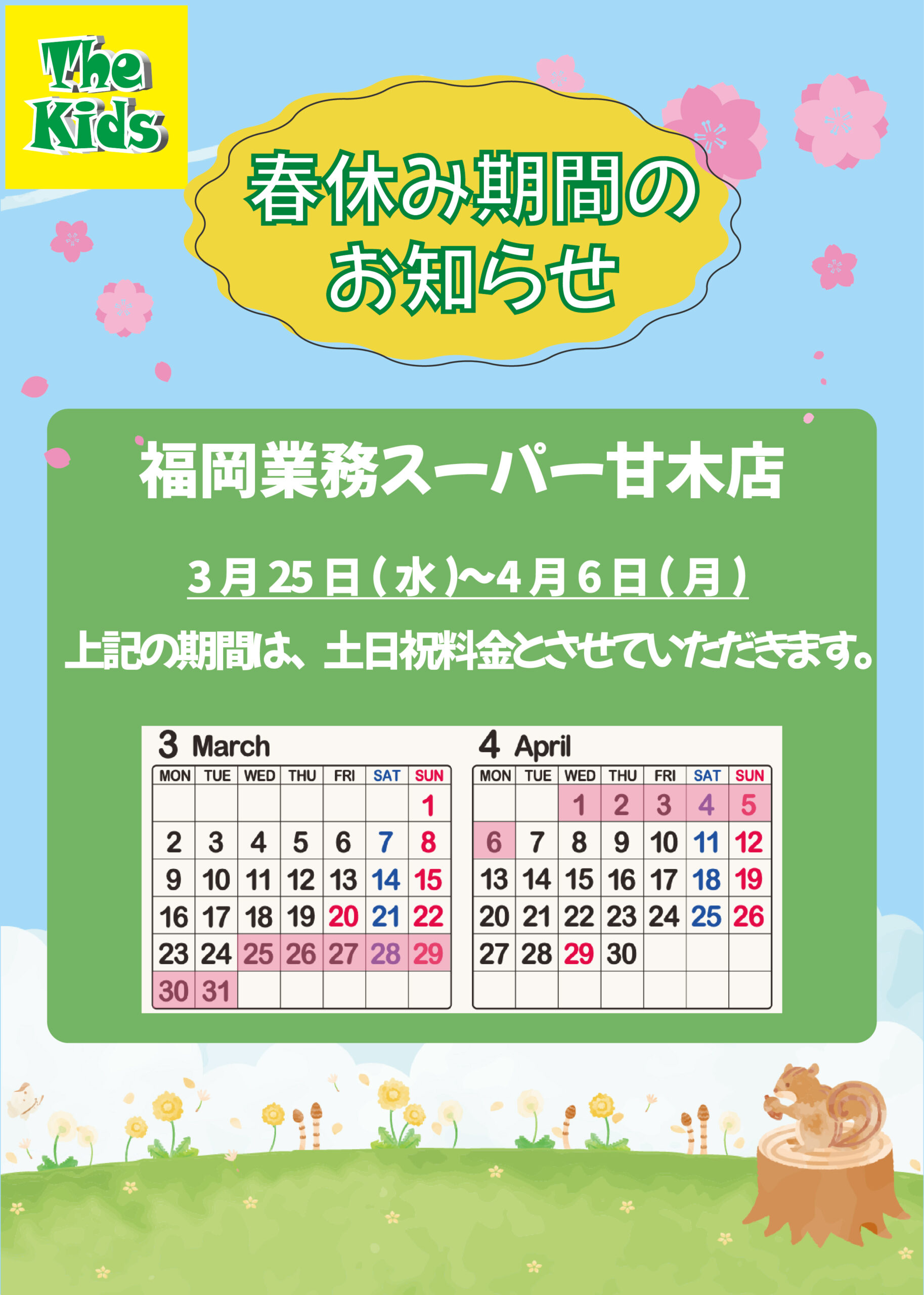 - 【休日※】土日祝、国民の休日および保育園・幼稚園・学校が長期休暇となる春・夏・冬休みの期間中など当施設が定める特定日が休日扱いとなります。